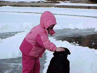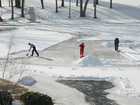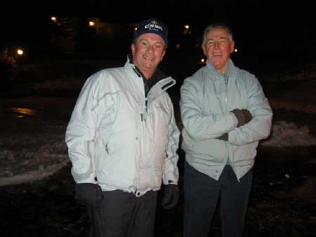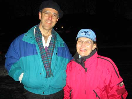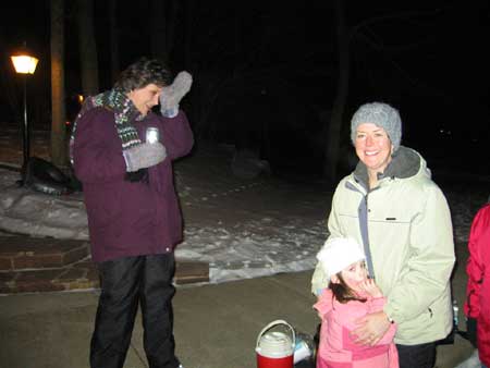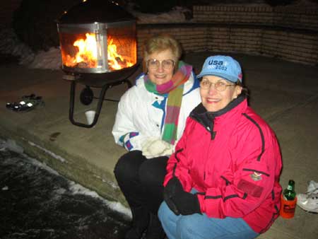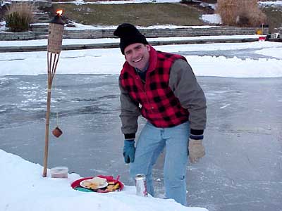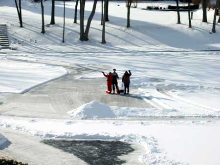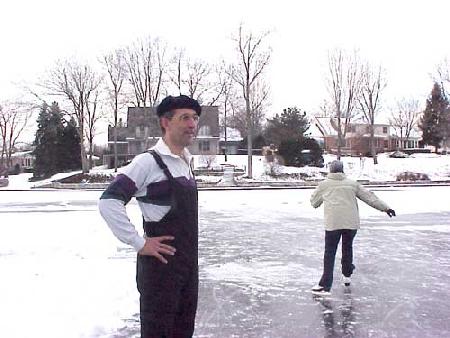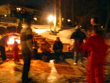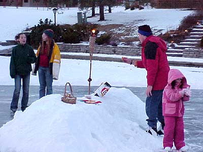| Two days earlier the Morlands and the Nichols had cleared several paths through the snow on the lake and verified that the ice was thick enough to skate safely. John Valassiades helped with the shovelling for the big event and everyone contributed to the overall success of the evening. |